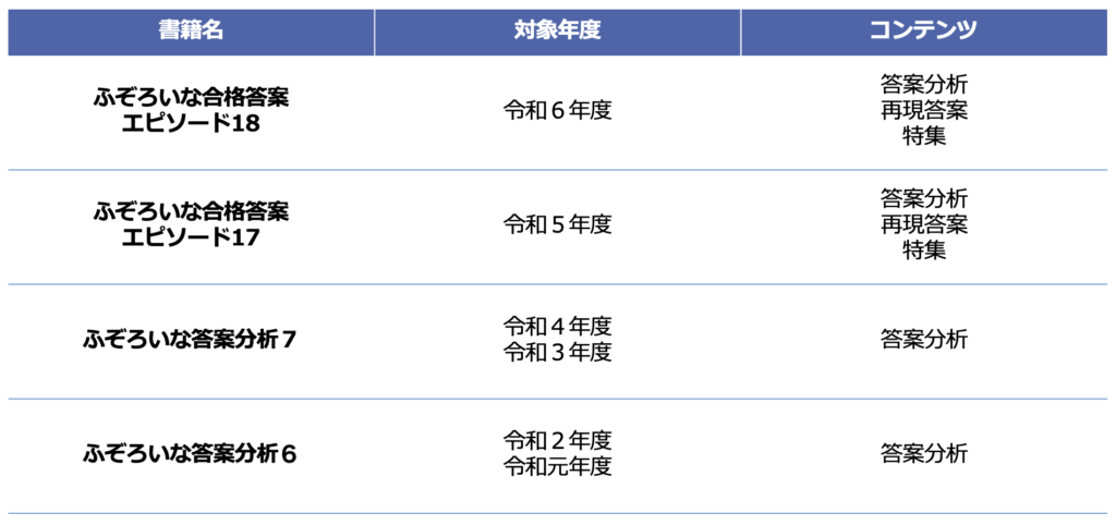 「ふぞろいな合格答案シリーズ」には、各年度の2次試験に対応して毎年出版する前述の「ふぞろいな合格答案」と、「ふぞろいな合格答案」を構成するコンテンツである「ふぞろいな答案分析」、「ふぞろいな再現答案」と「特集記事」を複数年分をまとめて収録しているシリーズがあります。(詳細は下図参照)
