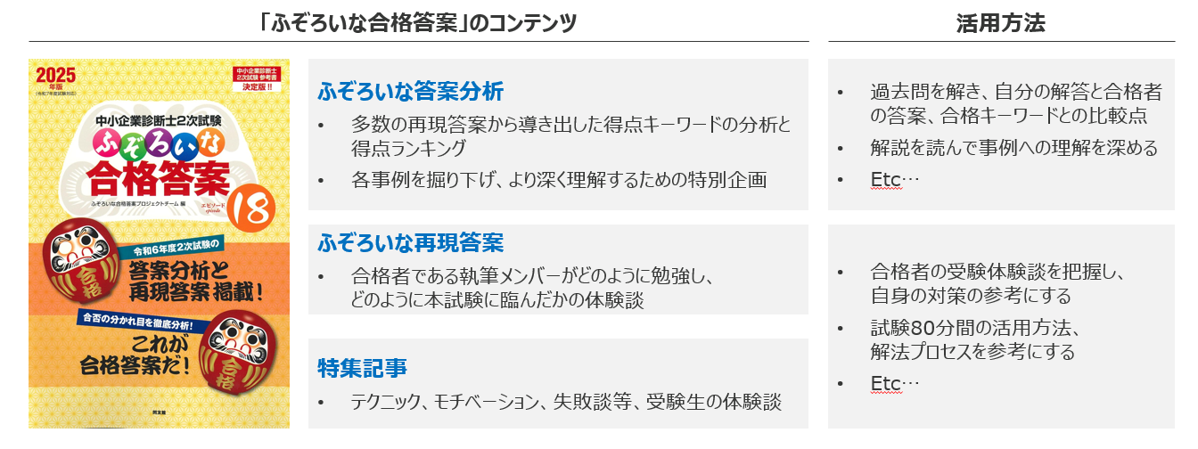 「ふぞろいな合格答案」とは、診断士2次試験(筆記)を受験した方から本試験の再現答案を提供いただき、それら多数の答案から得点につながったキーワードを分析した診断士2次試験の対策書のことです。