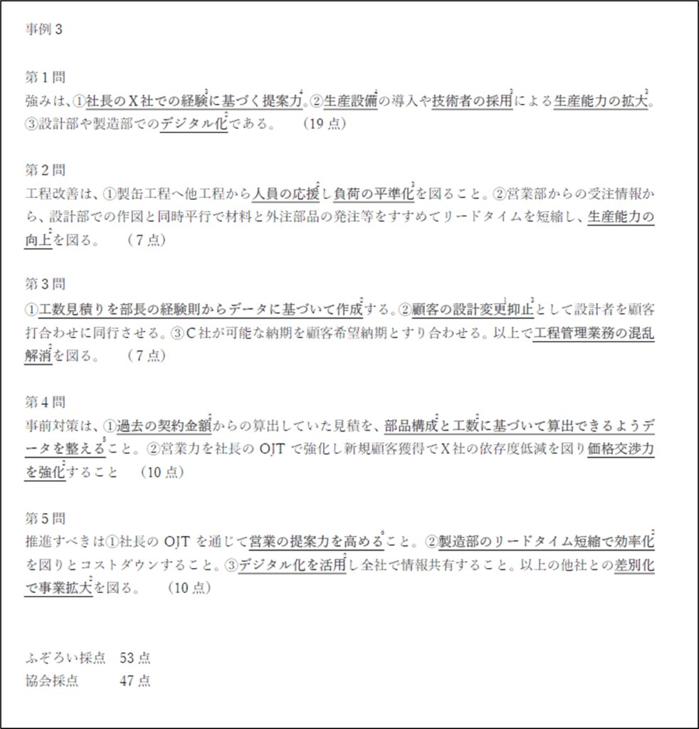 では次に、事例Ⅲも同様に考察してください。本試験の結果は47点で、ふぞろい採点の結果は53点でした。採点結果は添付します。