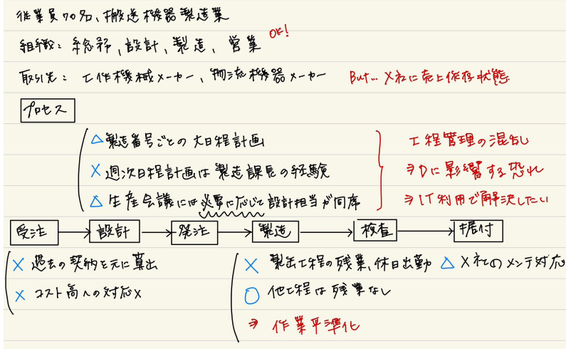 可視化することで、与件文に記載されている問題の拾い忘れがなくなりましたし、工程が整理されて解答を作りやすくなりました。こういった自分なりの解法の型があるかが二次試験では重要と感じています。